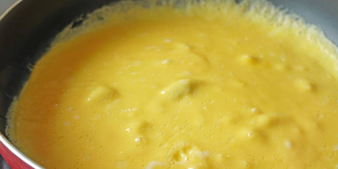 4、鍋中刷上一層食用油,油熱後倒入蛋液,小火煎至一面定型後翻另一面,煎至鼓起大泡就可以出鍋瞭,然後把雞蛋餅先切成小長條,再切成小塊兒後裝盤備用;