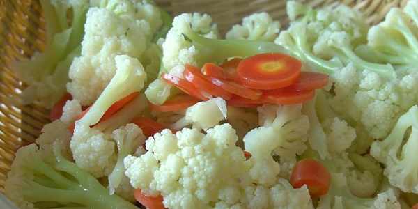 5、現在我們花菜清洗一下後撈出來,鍋中燒半鍋水,加1勺食用油,水開後把花菜倒進去,胡蘿卜也倒進去,然後焯水三分鐘,煮熟瞭就可以撈出來瀝幹水分放涼瞭;