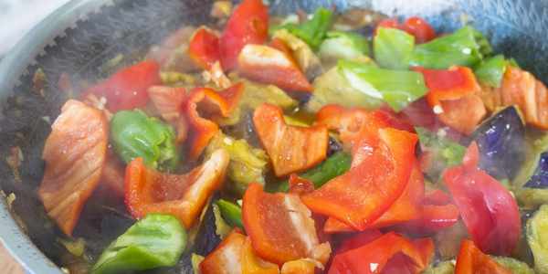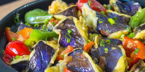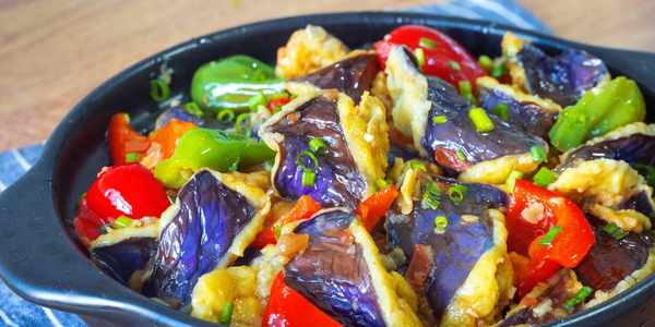 大火煮開後倒入炸好的茄子,還有青紅辣椒,然後蓋上蓋子,煮開後倒入茄子燜2分鐘,關火後翻拌均勻就可以出鍋瞭;