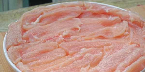 2、雞脯肉切塊,打一個雞蛋,隻要蛋清;
