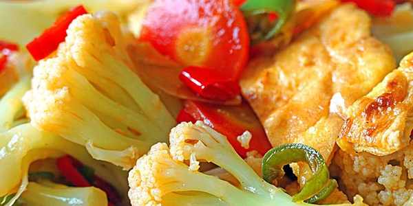 〖食材清單〗一顆花菜、一個胡蘿卜、紅線椒、青線椒、蒜片、3個雞蛋、1勺淀粉、1勺食用油