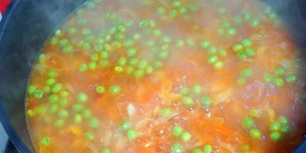 7、青豆加進去炒一會兒,一碗清水,大火煮開,小火再煮5分鐘,下入肉片,煮3分鐘;