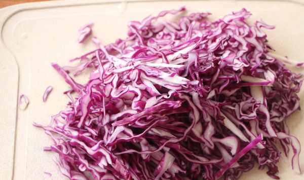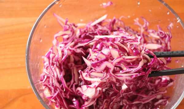 4、紫甘藍用流動的清水清洗幹凈,瀝幹水分,切成絲,越細越好!