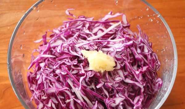 5、切好的紫甘藍放在碗中,加入蒜泥,蒜泥上澆上一勺熱油;