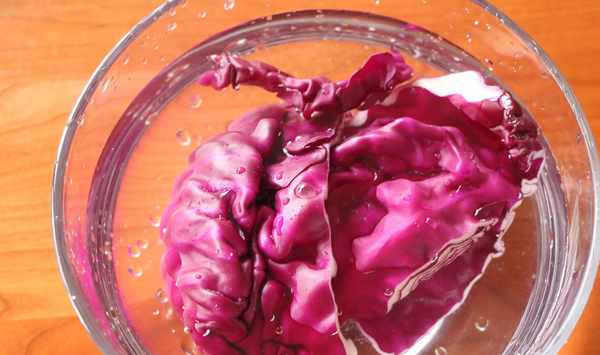 2、紫甘藍掰開放在清水裡,加點鹽浸泡10來分鐘;
