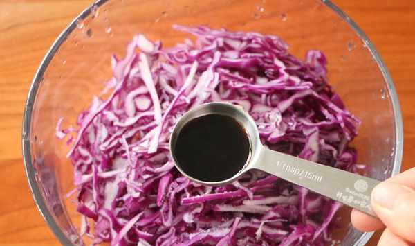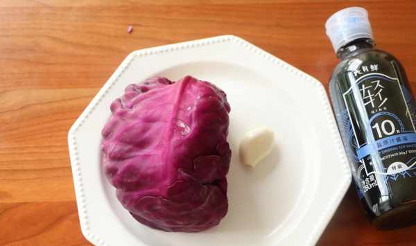 制作配料:紫甘藍1/3個大蒜1個鹽1/3勺米醋1勺生抽1勺香油1勺