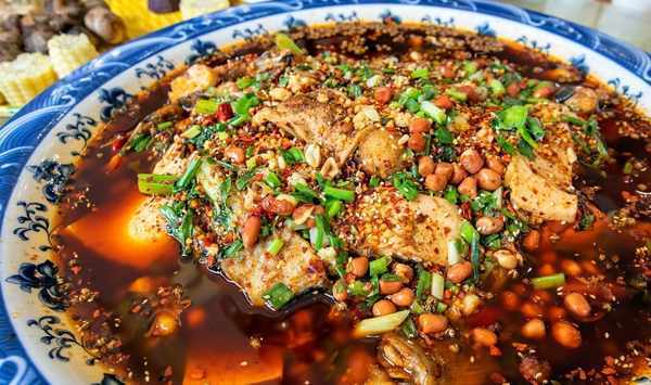 光看還不過癮,我也要投入實戰體驗一把。一上桌,就吸引了全桌人的目光。從賣相來說,是典型的川菜造型。紅油汁,加上綠色小葱段,油酥土豆,這些都是川菜常見的打底輔料。從鋪在上面的豆腐來看,這道菜的麻辣味是靈魂。果不其然,服務員介紹:三溪口豆腐魚的靈魂就是自家泡椒、花椒等作料,味道好不好除了火候外,最根本的就是這些佐料是否傳神了。魚肉嫩滑且入味,讓人不由自主地稱讚。據悉"辣得够勁、麻得舒爽、鮮得巴適"是三溪口豆腐魚的三大亮點。憑這三點,也讓三溪口豆腐魚在川菜江湖中立穩了足!