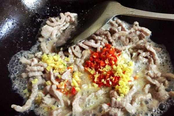 5、鍋中準備適量的油,先加入醃制好的肉絲下鍋翻炒出香味,炒到變色斷生,然後加入切碎的薑末和泡椒,翻炒出香味。