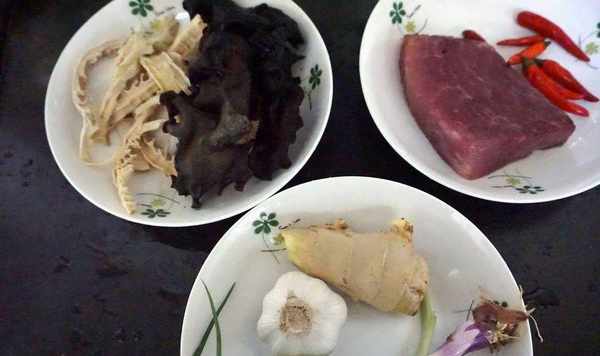 1、首先準備好的需要的食材,豬肉選擇瘦肉,泡椒最好是選擇紅色的,這樣做好之後成菜顏色更鮮艷。木耳提前浸泡好,蔥薑蒜就不用多說瞭。