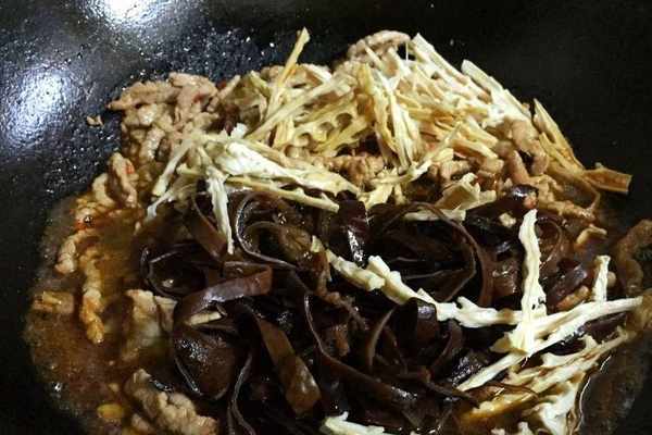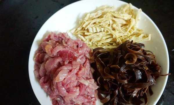 2、筍幹,豬肉和木耳都是清洗幹凈,然後切成細絲,豬肉的細絲最好要切得均勻一些,這樣做好之後口感會比較統一。