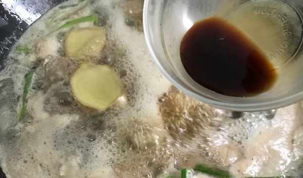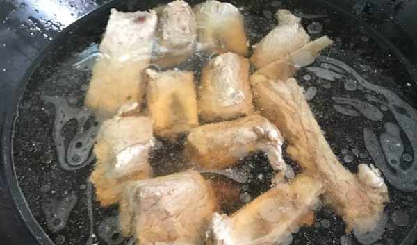 4、另起鍋註入適量的清水燒開,把豬肋排和適量的料酒也都倒進去,焯至豬排變色,出現浮沫,撈出來。用溫水將豬肋排身上的血沫都清洗幹凈。