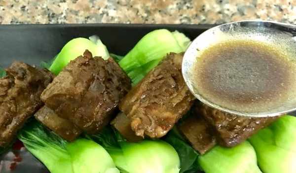 7、所有的配料都加完瞭以後轉成小火繼續煮個30~40分鐘,把鍋裡面的湯汁收幹即可。排骨夾出來放在上海青上面。