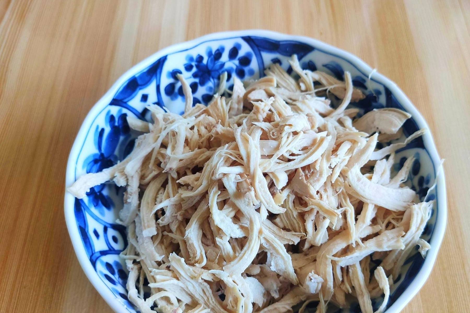 3、把雞胸肉撈出來,晾一會兒,要不然燙手,順著雞胸肉的紋理,撕成雞肉絲備用。