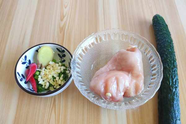 所需食材:黃瓜1根、雞胸肉1整塊、料酒1勺、小米辣2個、蒜2瓣、小蔥1顆、薑2片、白芝麻1勺、辣椒面1勺、熱油適量、生抽2勺、醋1勺、老抽半勺、白糖半勺、鹽少許。