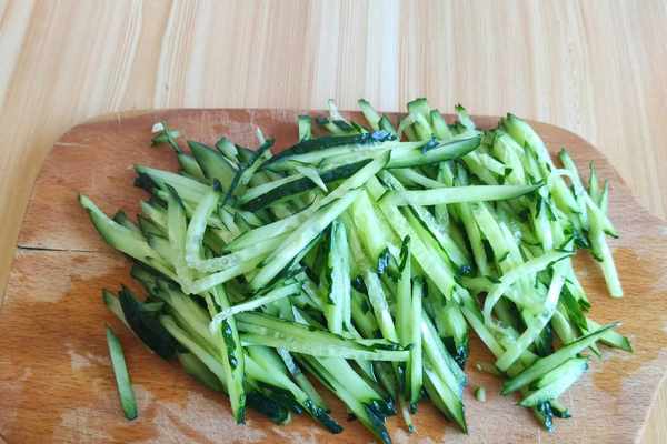 4、再把黃瓜切成絲,如果刀工不好,可以用搓絲工具哈!