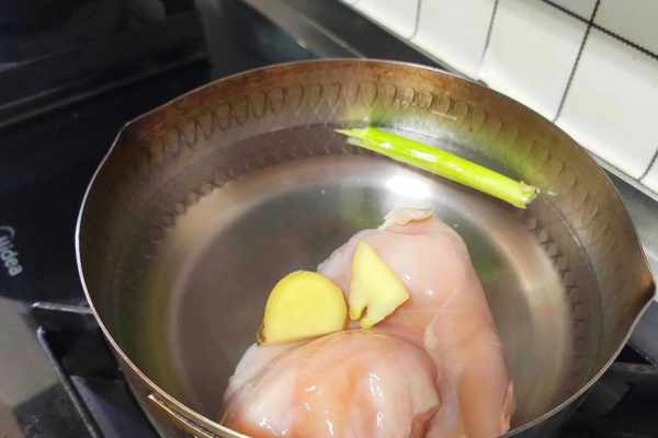 2、雞胸肉放入鍋中,加入適量清水,加入薑片、蔥白部分、料酒,煮至沸騰後,撇去浮沫,再小火煮15分鐘。