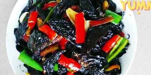 4.曬好的茄子幹炒一道傢常菜,炒之前浸泡二十分鐘,切塊備用。鍋裡放油把大蒜炒香,倒入茄子幹,翻炒片刻後放鹽,倒入一點客傢米酒(這是炒茄子幹的精華部分),燜煮一分鐘後,放入切好的青紅椒,翻炒一分鐘,最後加入一點生抽提鮮,翻炒均勻後即可出鍋