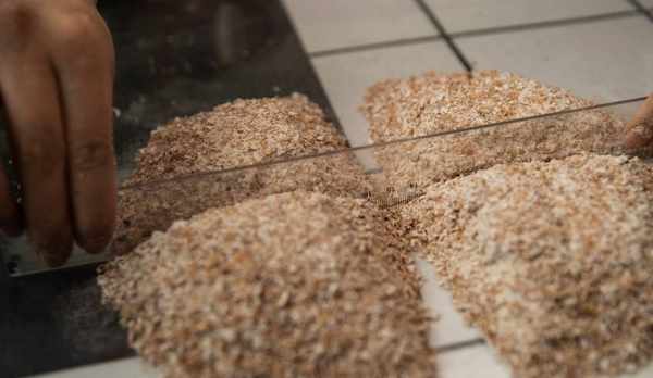 在制曲五車間制曲10班,班長章吉會不時到二樓粉碎機前查看小麥的磨碎度,有時也會借助篩盒檢測小麥塊皮和細粉比例情況,確保磨碎度符合工藝要求。
