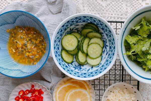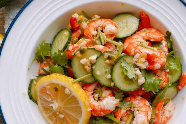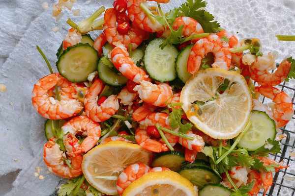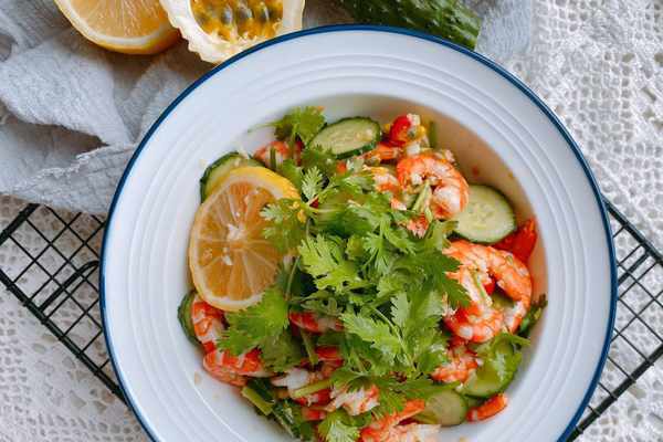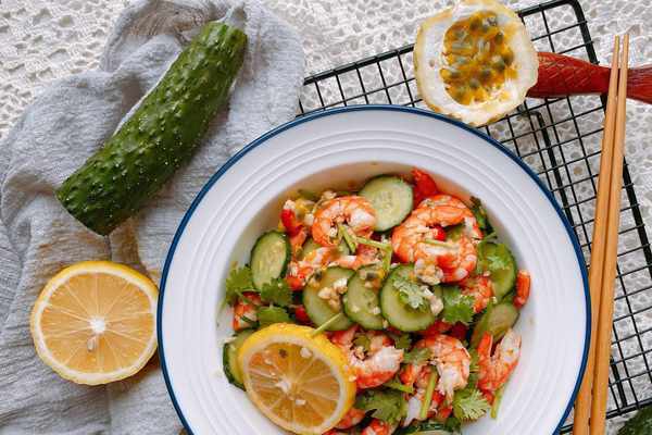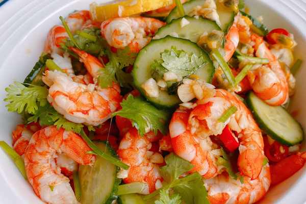 【原材料】鮮蝦、黃瓜、百香果、檸檬、大蒜、香菜、小米辣、食鹽、生抽、香醋、白糖、香油;