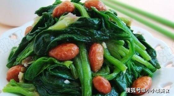 4、菠菜切段,加入醬油、米醋、砂糖、鹽、蒜茸、香油拌勻,撒上花生米。