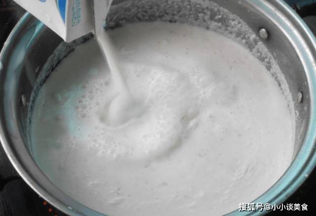 第四步:花生煮5分鐘後,加入兩塊冰糖調味,讓花生奶更甜。煮至融化,冰糖溶化後倒入最好的牛奶,然後繼續中火加熱,將牛奶加熱至沸騰。