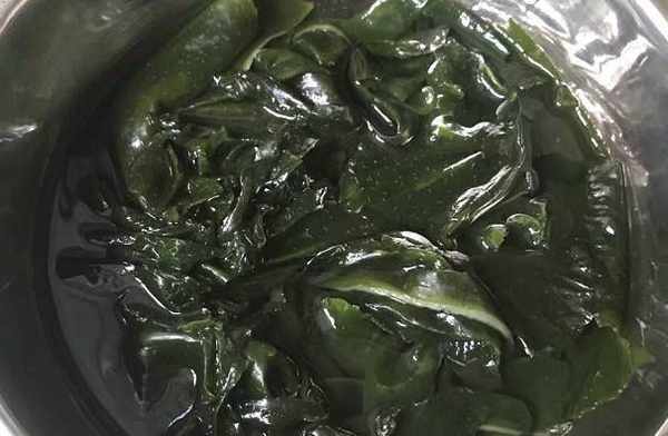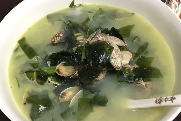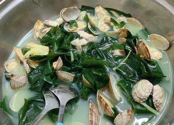 起鍋,倒入少許食用油,等油溫回升,先放入蔥花炒香,加少許水燒開,放入裙帶菜和花蛤,加少許鹽,五香粉,調味後即可出鍋。