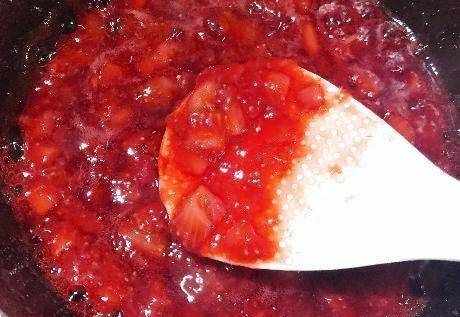 第四步,過程中一定要不斷攪拌。當看到草莓慢慢變軟,湯汁也比較濃稠時,擠入半個檸檬的汁,繼續小火煮至鍋內沸騰。當槳葉升起和落下時,這種情況仍然會發展;