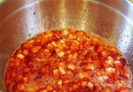 第三步,蓋上一張保鮮膜,醃一個小時左右。準備一個不粘鍋,裡面沒有水和油。將所有醃好的草莓和汁倒入鍋中,開小火。慢慢煮;