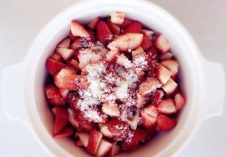 第二步,控制好草莓表面的水分,將草莓切塊放入無水無油的容器中,加入白糖調味,戴上一次性手套拌勻。將草莓均勻輕捏;