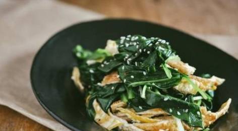 4、然後放一點雞精下去攪拌均勻,把切碎的香菜放在海帶絲上。