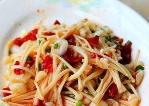 2、燒開一鍋水,水開後放入金針菇;大火蒸8~10分鐘,出鍋後倒掉湯汁;撒上蔥花;小火煮開適量油,馬上把滾油淋在蔥花上;拌勻即可開吃,辣辣的,很開胃。