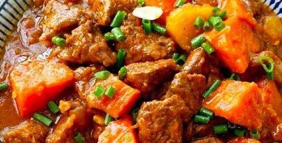 1牛肉切大塊放入沸水中汆燙一分鐘,隨即撈出沖洗幹凈。胡蘿卜和土豆分別切滾刀塊備用。