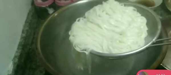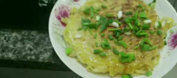今天就和大傢分享面條雞蛋餅的做法。那首先我們就準備把吃剩的面條開水給它下鍋。煮個七分熟就可以給大傢撈出來瞭。時間不要煮太久瞭,整個七分水就差不多瞭。