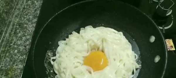 然後我們在平底鍋上均勻的刷一點油,下入面條,把中間給它搞個洞,再把蛋黃倒進去。全程小火慢煎,三分鐘左右就可以給他翻個面,繼續煎,