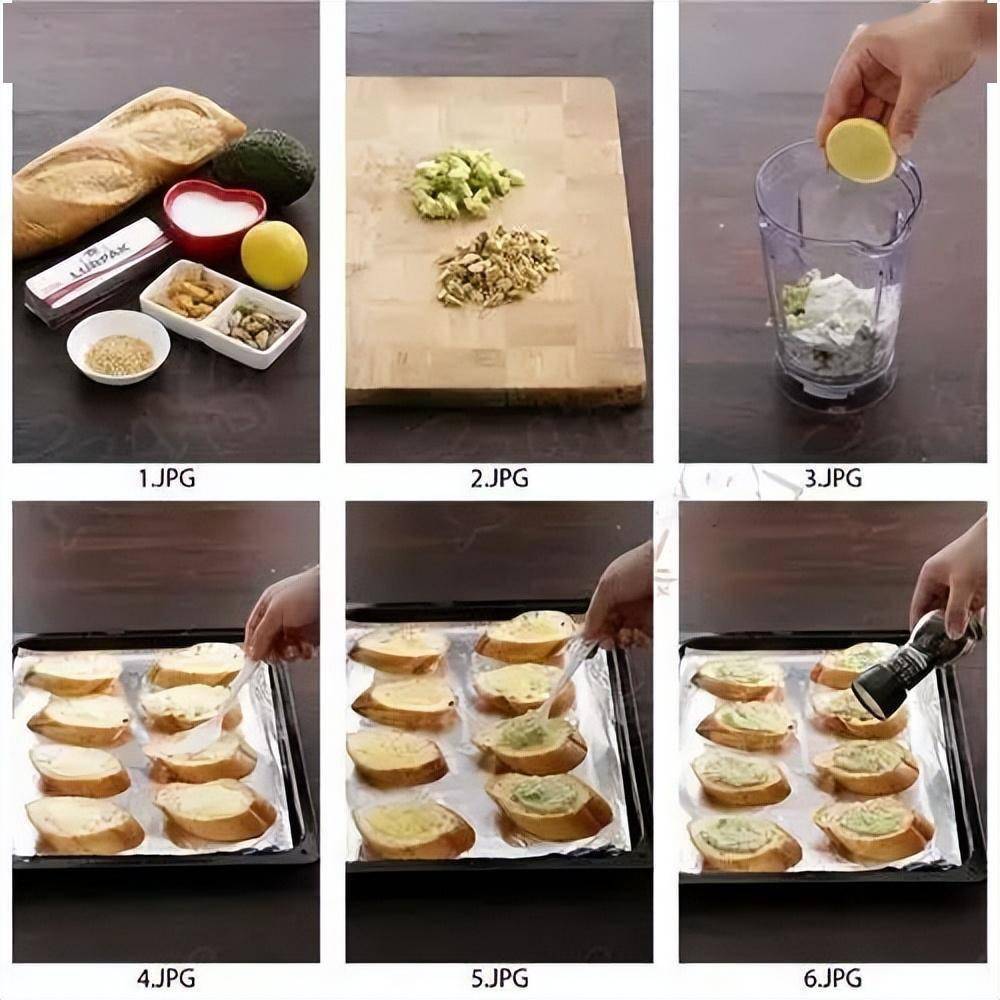 1)法棍切成約1cm厚的片,牛油果用勺子挖出果肉切成小丁,腰果、開心果切小丁,檸檬擠出汁,備用。