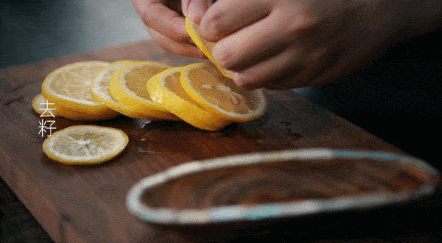 1、先用鹽檸檬搓一下表皮,再把檸檬放清水裡浸泡5分鐘,泡完後洗凈,切片,去籽。