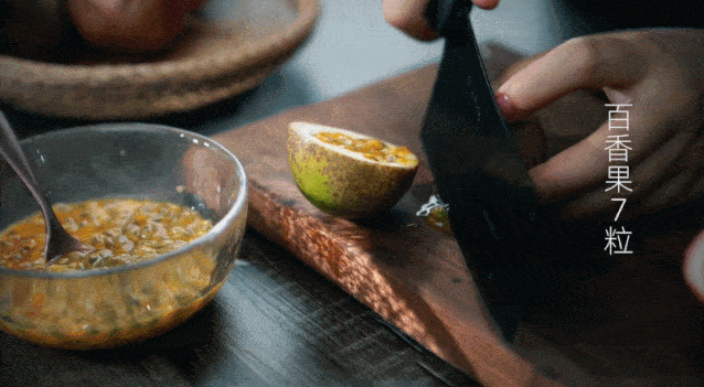 2、浸泡檸檬的同時,準備百香果。百香果橫切一刀,挖出果肉。