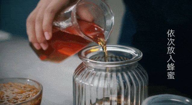 4、重復以上步驟至裝滿容器,最後在頂部鋪滿蜂蜜,放入冰箱冷藏過夜,隔天就可以取出來泡水喝啦。