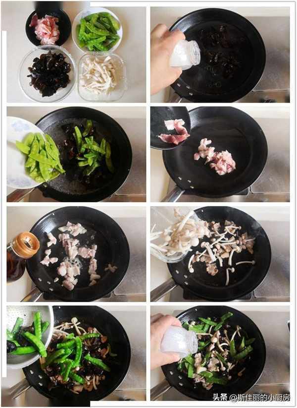 小貼士:1. 黑木耳提前用冷水泡軟; 2. 燒鍋水加入少許鹽,先將不易熟的黑木耳進鍋焯煮,荷蘭豆很易熟, 焯燙變色後撈出; 3. 五花肉微微煸炒出油, 加入料酒去腥, 再加入白玉菇進鍋翻炒至八成熟; 4. 最後加入焯好的配菜翻炒兩下後加入鹽調味即可。