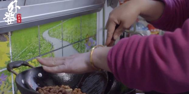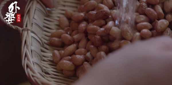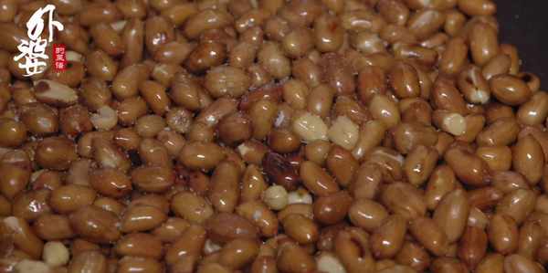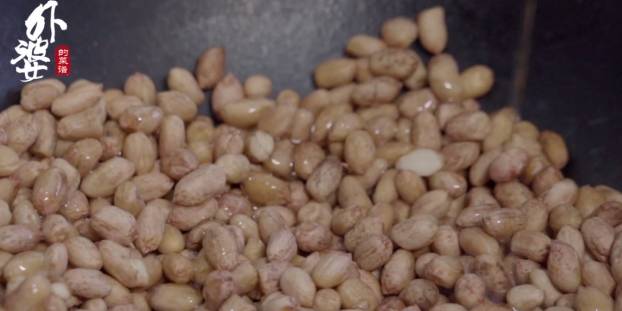 這裡花生米需涼油下鍋,如果熱油下鍋,花生衣會變得焦苦,色黑無賣相;當花生米汆至七八成熟,撥動時有幹燥的聲響,手掌伸開能感受到熱氣就可以盛出,不能等到完全熟後再撈出,否則會糊。