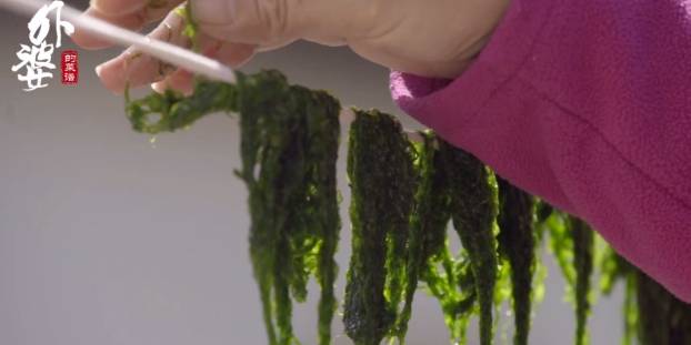洗苔菜一定要用海水洗,有經驗的人在洗苔菜時會掌控洗滌的程度,隻是恰到好處地濾去一些浮泥,而不會一味地去壓榨裹在裡面的海水味,這樣曬出來的苔菜口感不苦澀,且帶有咸香。