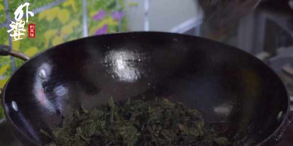 5、不開火,利用鍋內餘溫,倒入適量油,放入剪碎的苔菜爆香。