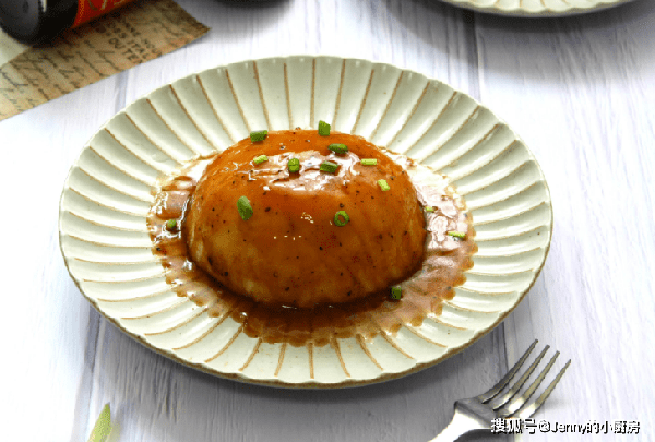 土豆泥倒扣在盤內,再澆上黑胡椒汁,這道菜就做好瞭。