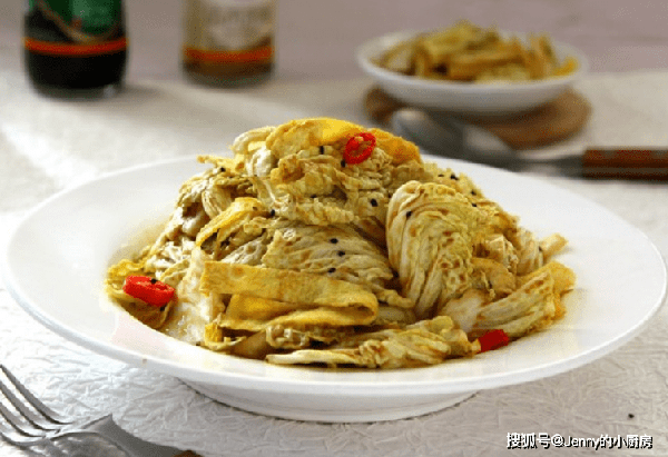 最後將白菜、雞蛋、芝麻醬放在一起,再倒入少許熟黑芝麻、辣椒圈攪拌均勻,就可以裝盤食用瞭。這道菜其實有個名字叫“乾隆白菜”,不知道你吃過沒有?