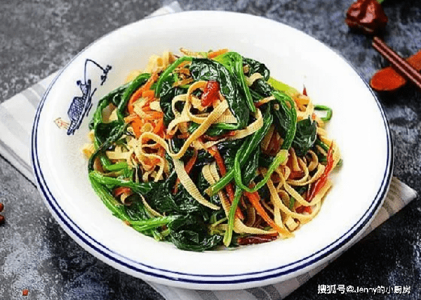 菠菜、豆腐皮、胡蘿卜放在一起,表面放入蒜末、幹辣椒,倒入剛燒的熱油激發出香味。