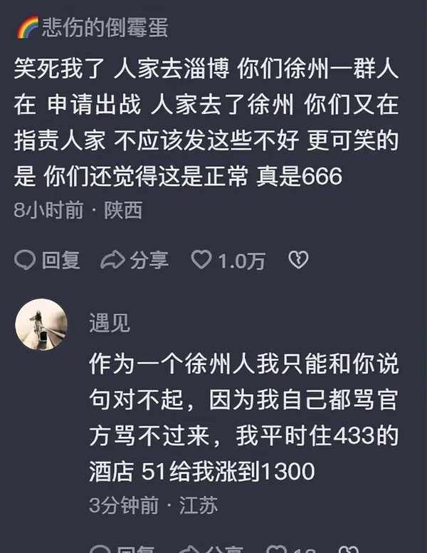 可是一觀評論區,好傢夥全都在罵戰,有的徐州本地人都在罵,給未知的網友帶來瞭不好的印象,他們說再也不會去徐州瞭。真的,挺難過的。就像你好不容易照顧到一個孩子變得優秀,但是他卻被外界以及自身的流言蜚語所攻擊。