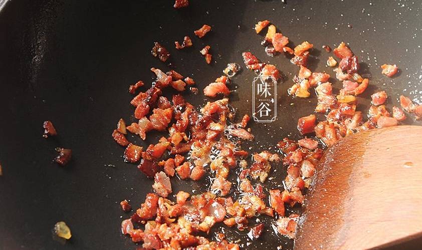 8、然後放臘腸和臘肉下去翻炒至出油;