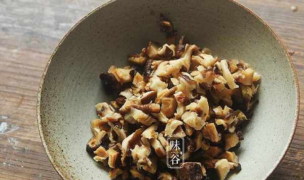 6、泡好的香菇去蒂切丁(泡香菇的水不要倒掉,有用)