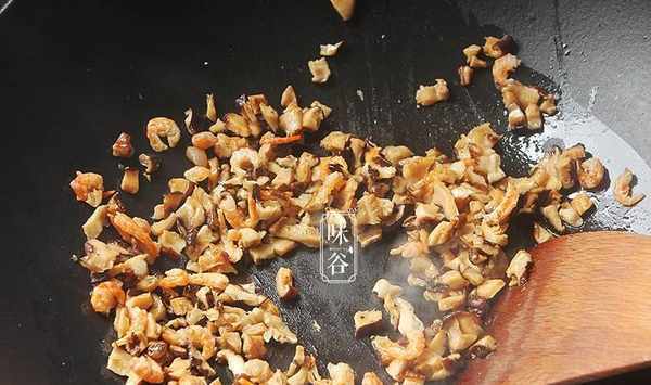 7、熱鍋放少許油,下香菇、海米翻炒出香味後取出來備用;