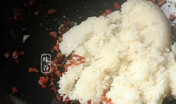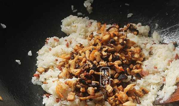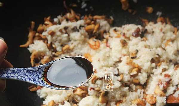 11、加入2湯匙醬油和少許鹽,繼續翻炒;(糯米飯如果結塊可放少量浸泡過香菇的水)